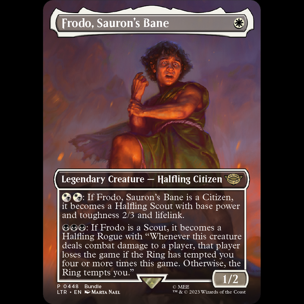 W/BW/B: If Frodo, Sauron's Bane is a Citizen, it becomes a Halfling Scout with base power and toughness 2/3 and lifelink.