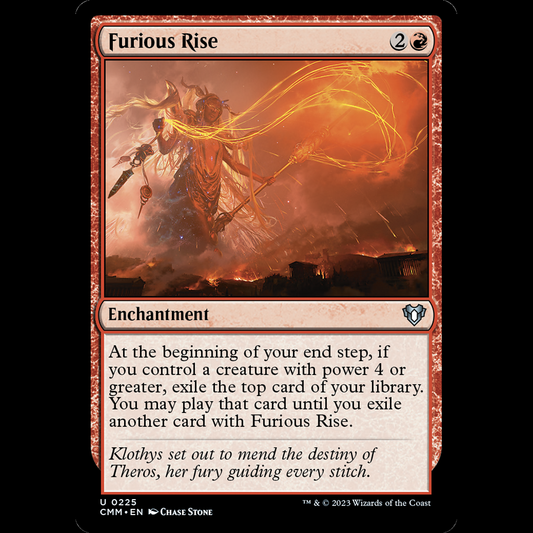 At the beginning of your end step, if you control a creature with power 4 or greater, exile the top card of your library. You may play that card until you exile another card with this enchantment.