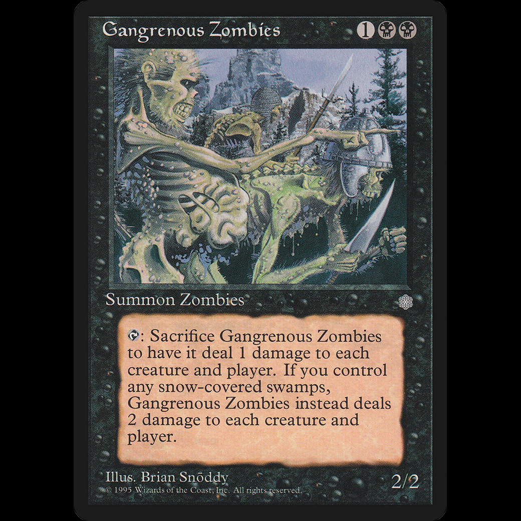 , Sacrifice Gangrenous Zombies: Gangrenous Zombies deals 1 damage to each creature and each player. If you control a snow Swamp, Gangrenous Zombies deals 2 damage to each creature and each player instead.