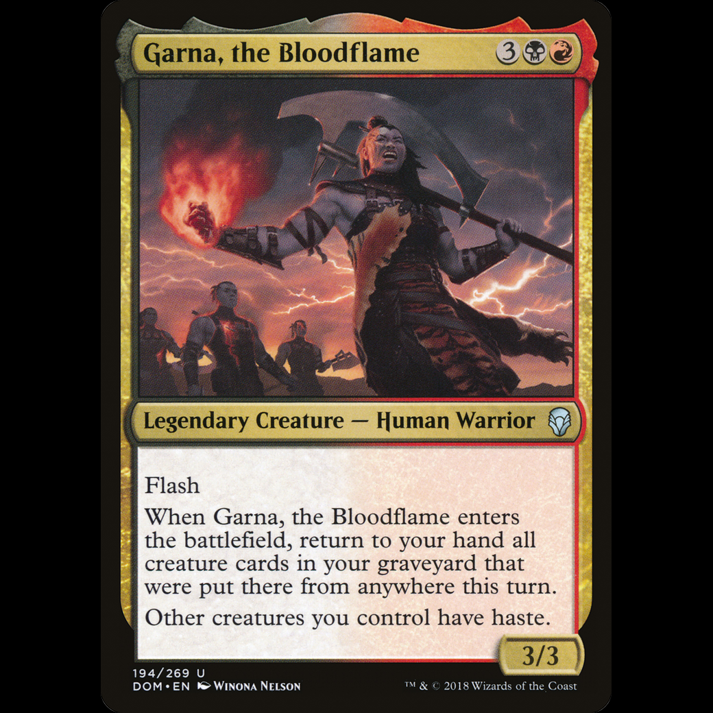 When Garna, the Bloodflame enters the battlefield, return to your hand all creature cards in your graveyard that were put there from anywhere this turn.