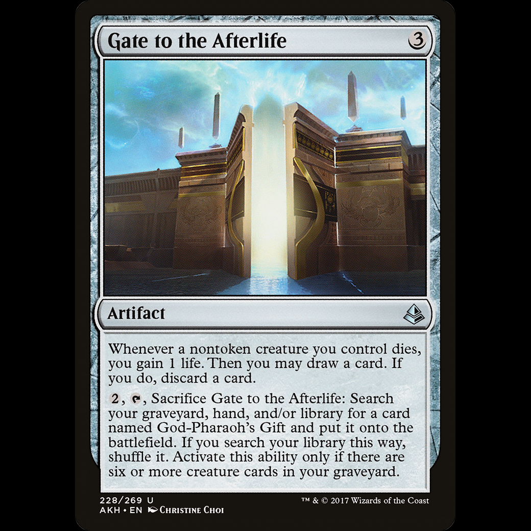 , , Sacrifice Gate to the Afterlife: Search your graveyard, hand, and/or library for a card named God-Pharaoh's Gift and put it onto the battlefield. If you search your library this way, shuffle. Activate only if there are six or more creature cards in your graveyard.
