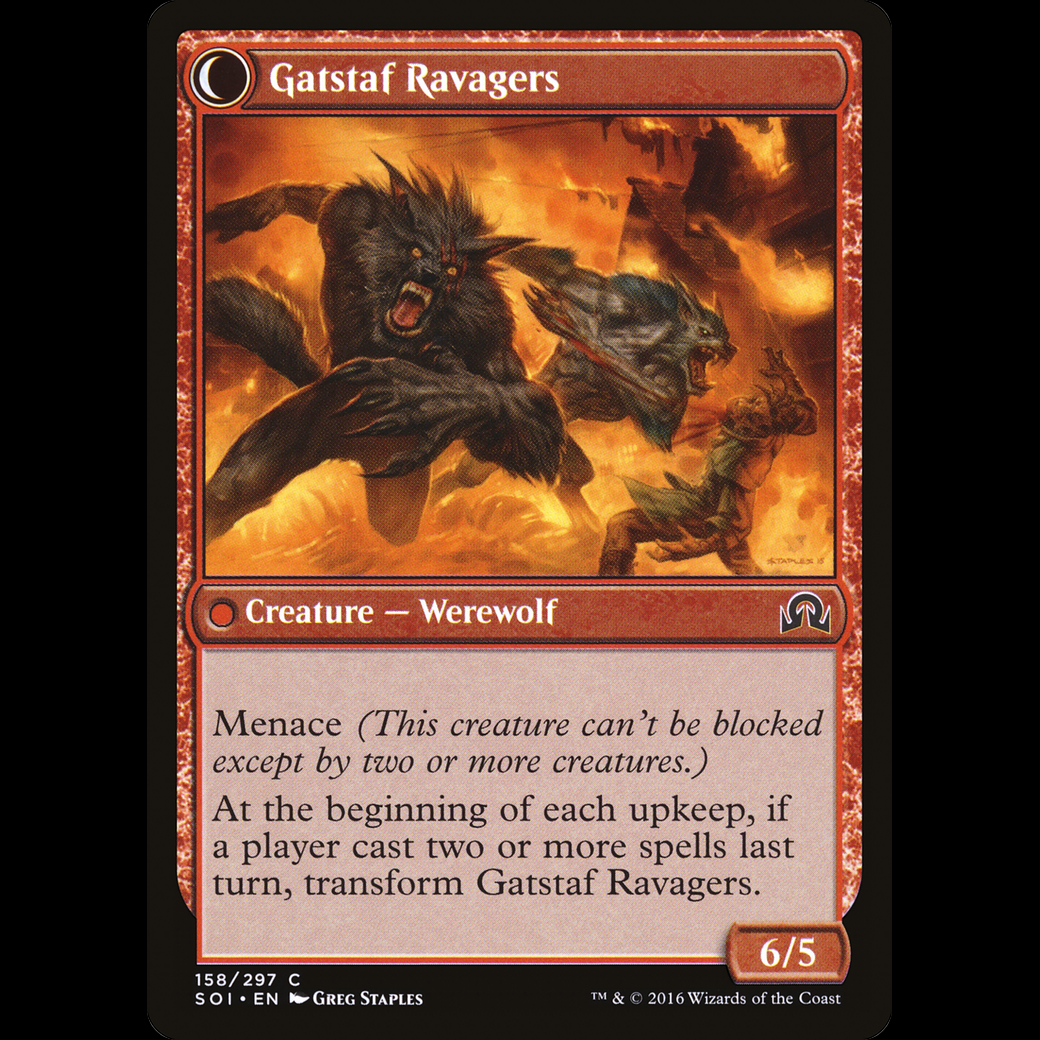 At the beginning of each upkeep, if a player cast two or more spells last turn, transform Gatstaf Ravagers.