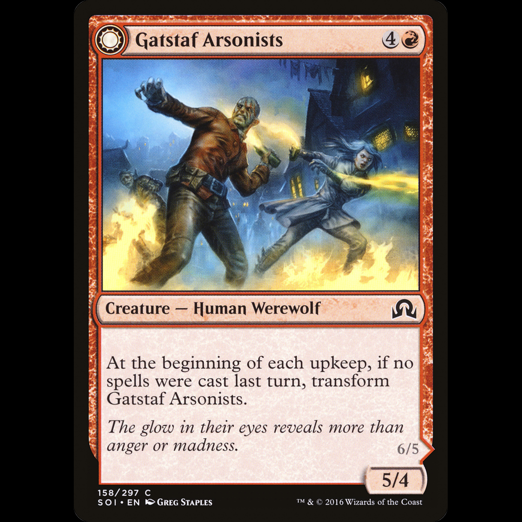 At the beginning of each upkeep, if no spells were cast last turn, transform Gatstaf Arsonists. // Menace (This creature can't be blocked except by two or more creatures.)