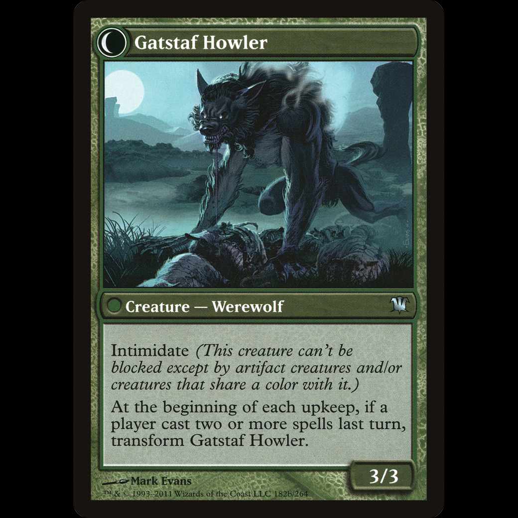 At the beginning of each upkeep, if a player cast two or more spells last turn, transform Gatstaf Howler.