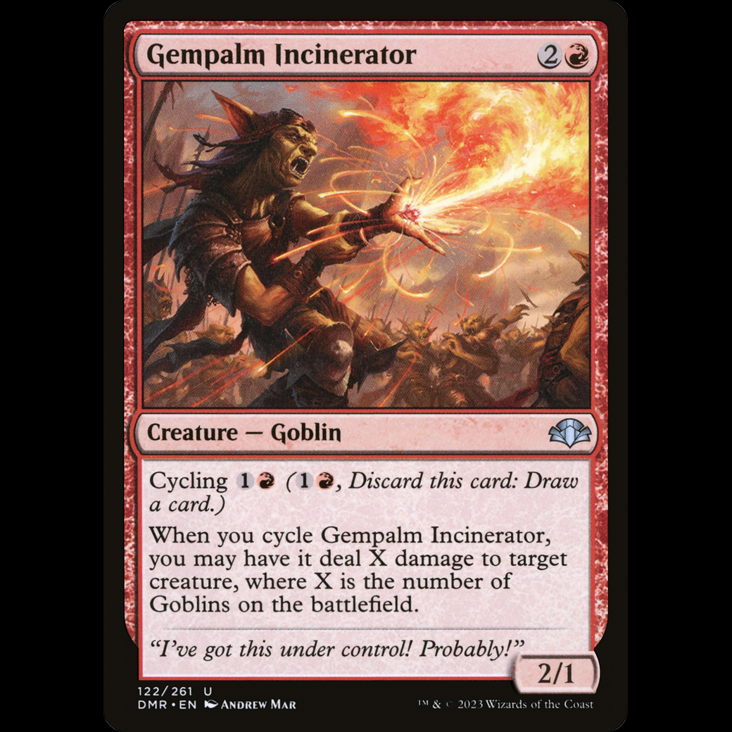 Cycling (, Discard this card: Draw a card.) When you cycle Gempalm Incinerator, you may have it deal X damage to target creature, where X is the number of Goblins on the battlefield.