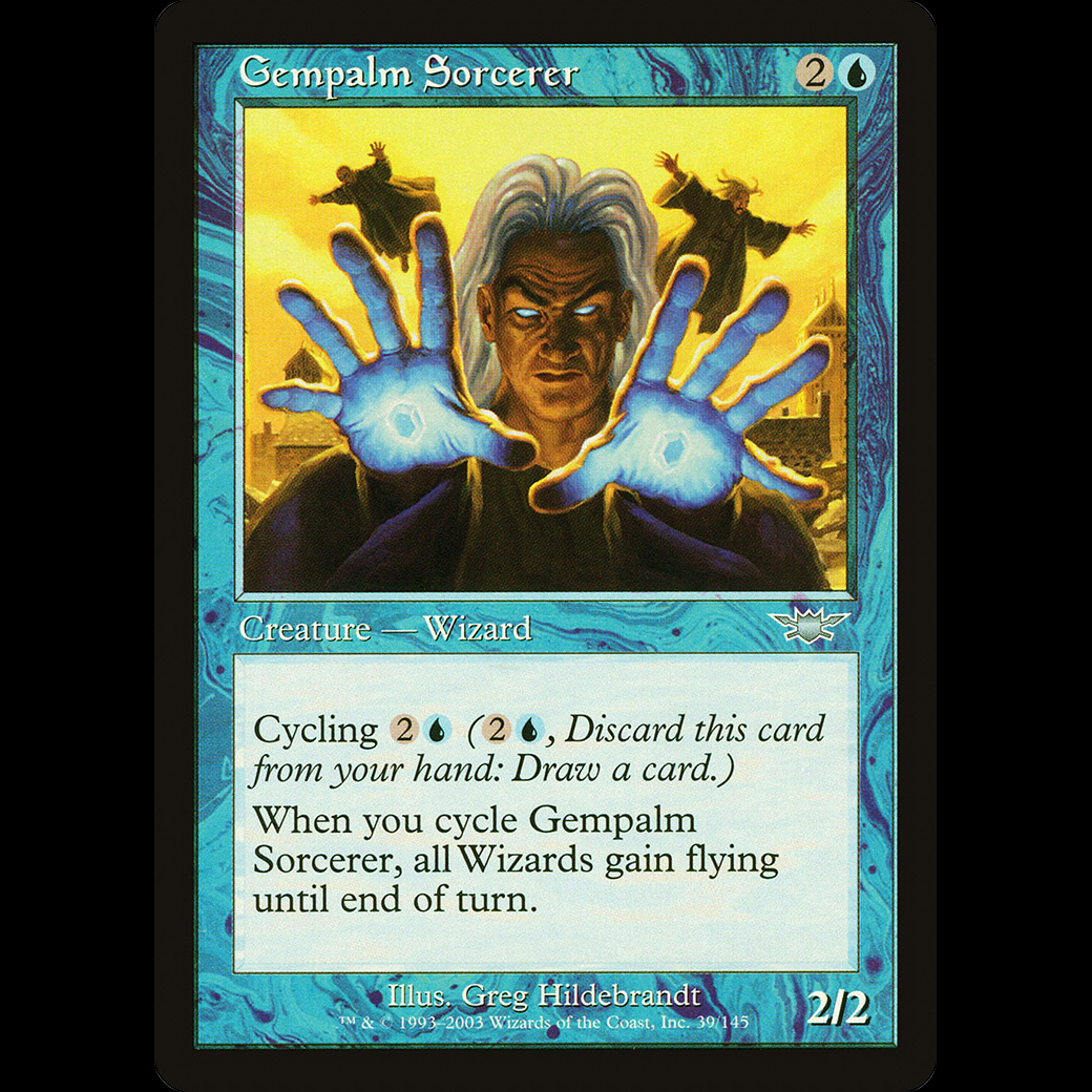 When you cycle Gempalm Sorcerer, Wizard creatures gain flying until end of turn.
