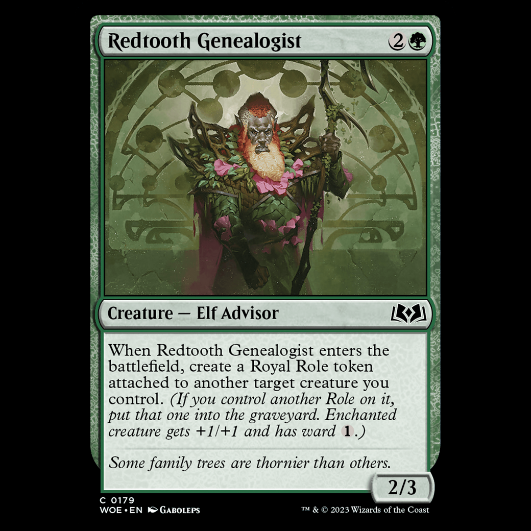 When Redtooth Genealogist enters the battlefield, create a Royal Role token attached to another target creature you control. (If you control another Role on it, put that one into the graveyard. Enchanted creature gets +1/+1 and has ward .)