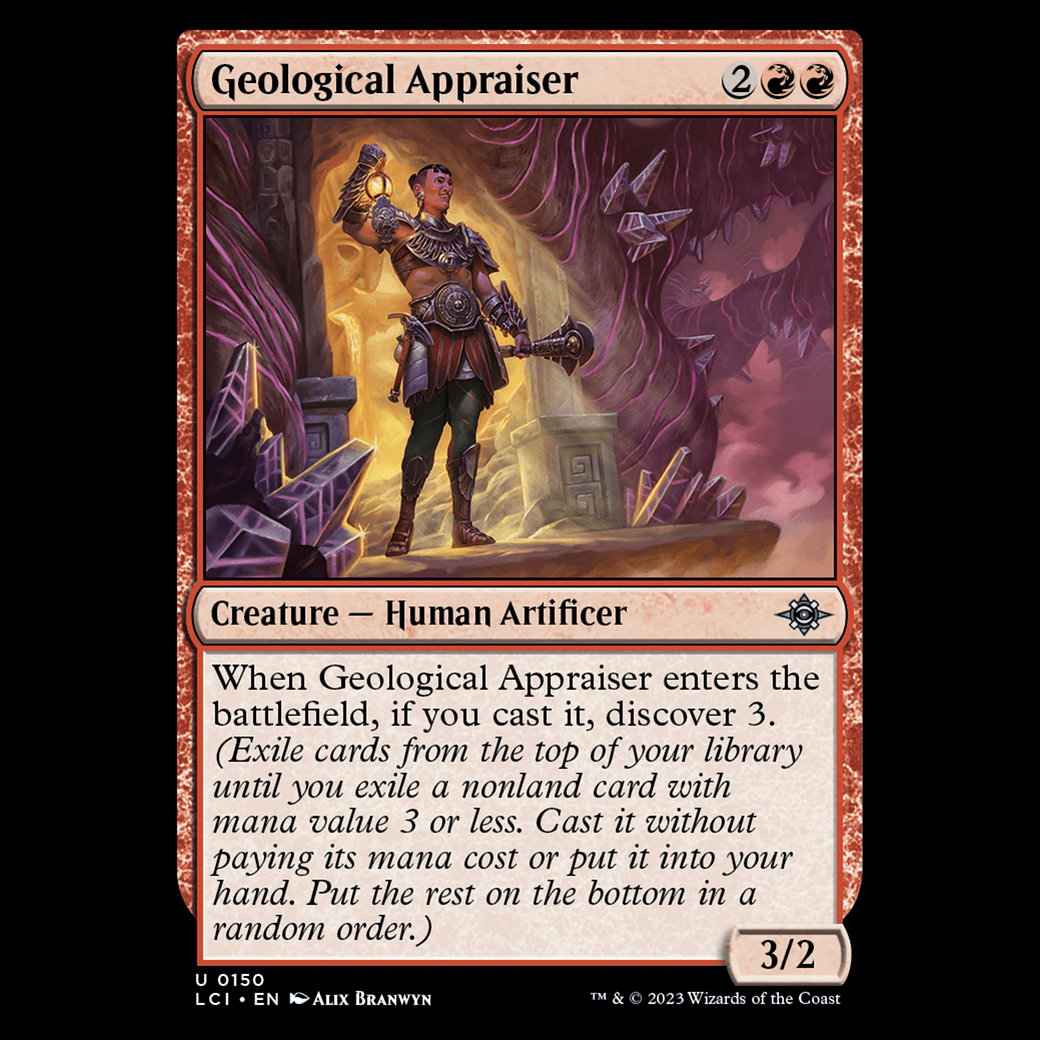 When Geological Appraiser enters the battlefield, if you cast it, discover 3. (Exile cards from the top of your library until you exile a nonland card with mana value 3 or less. Cast it without paying its mana cost or put it into your hand. Put the rest on the bottom in a random order.)