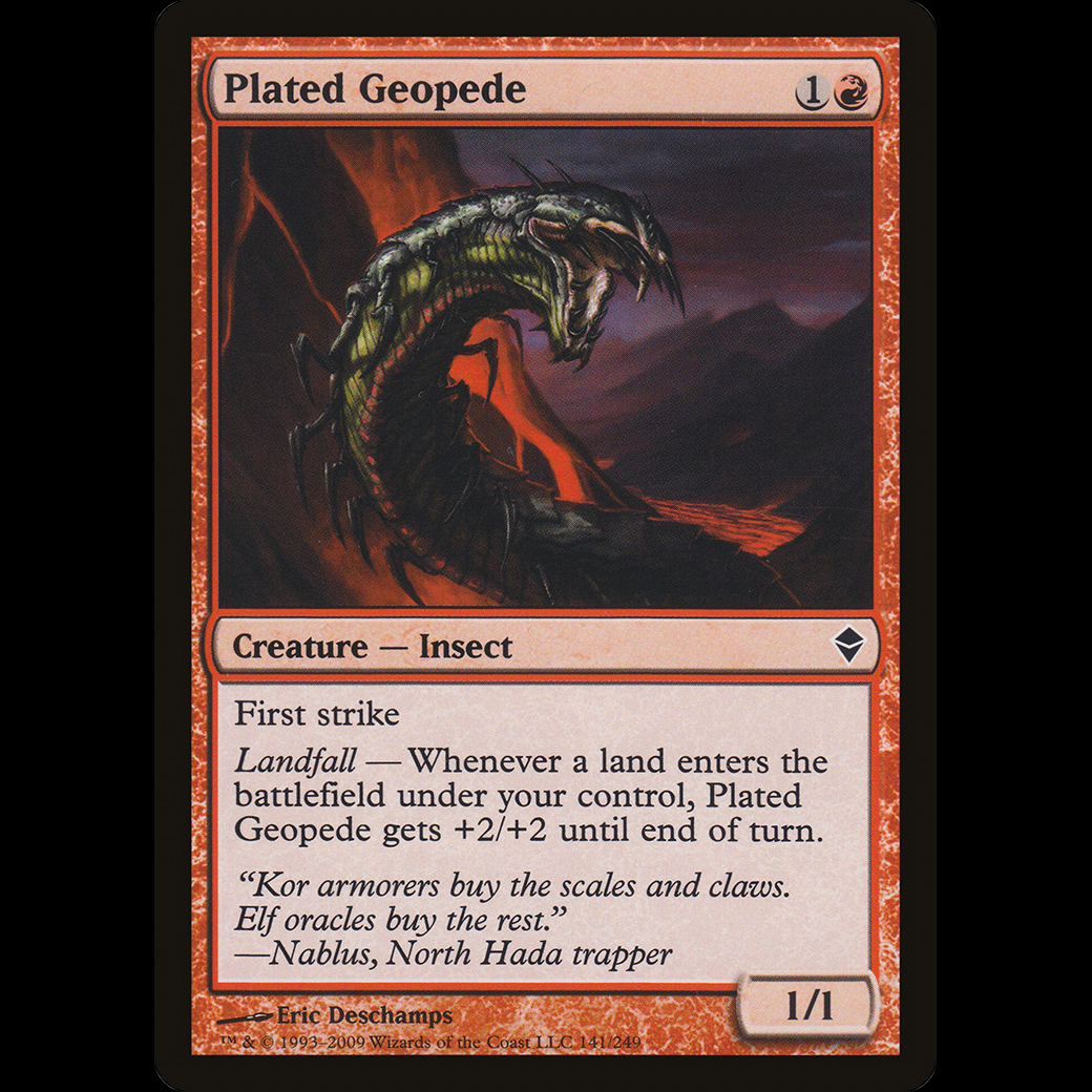 Landfall — Whenever a land enters the battlefield under your control, Plated Geopede gets +2/+2 until end of turn.
