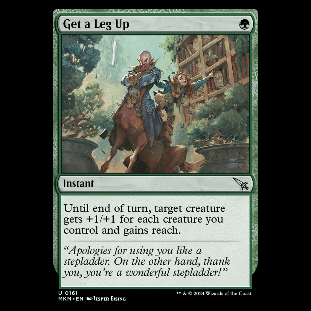 Until end of turn, target creature gets +1/+1 for each creature you control and gains reach.
