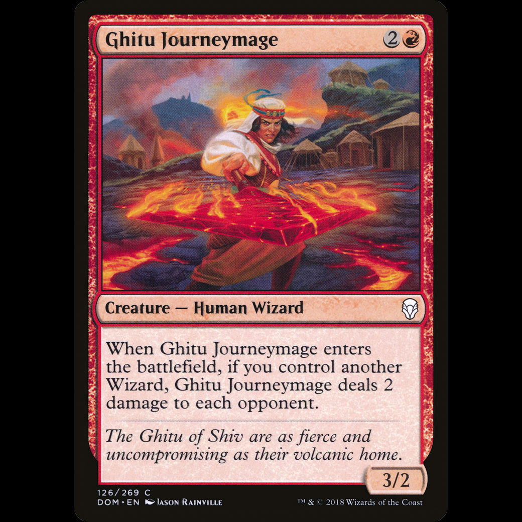 When Ghitu Journeymage enters the battlefield, if you control another Wizard, Ghitu Journeymage deals 2 damage to each opponent.