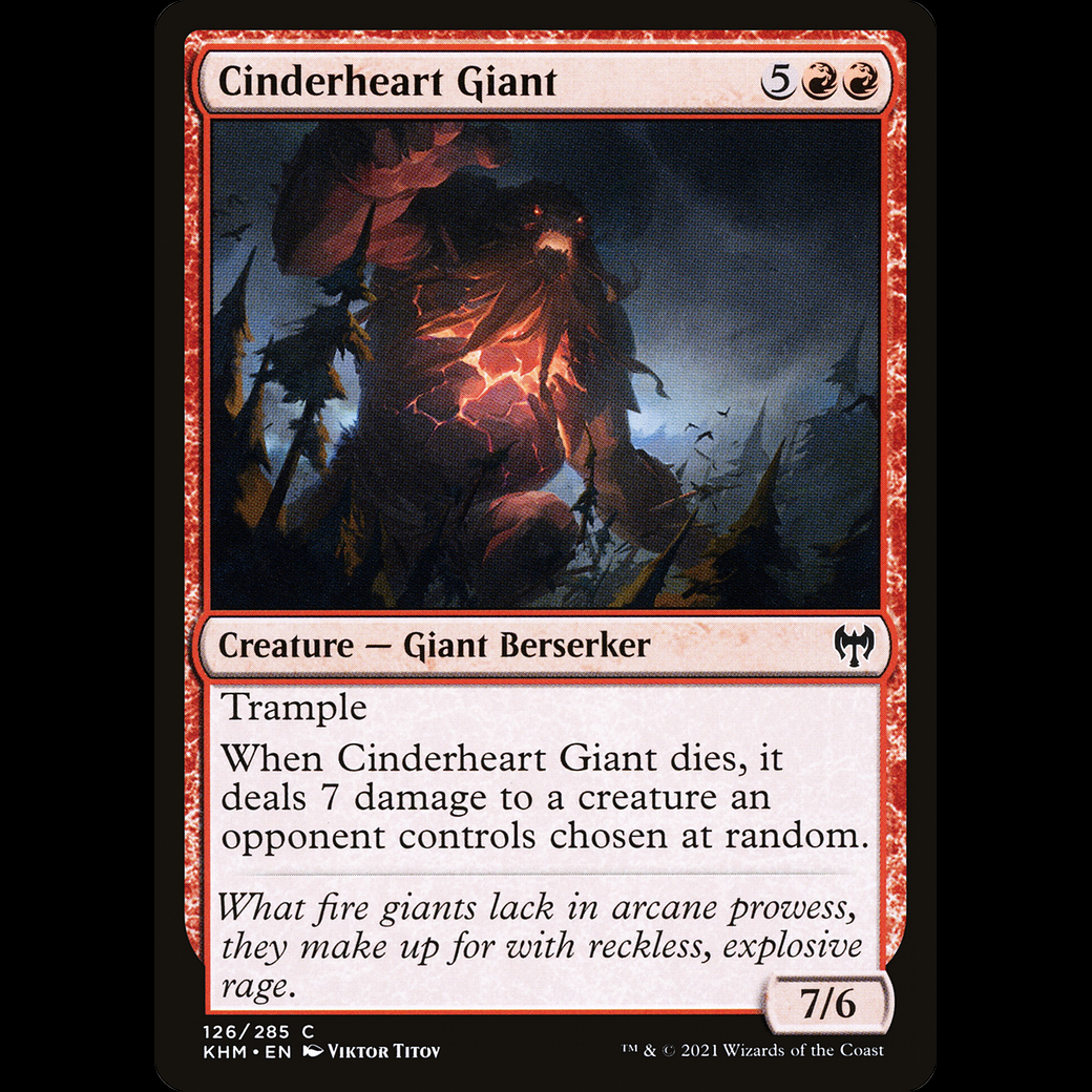 When Cinderheart Giant dies, it deals 7 damage to a creature an opponent controls chosen at random.