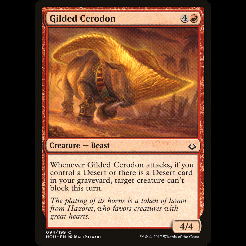 Whenever Gilded Cerodon attacks, if you control a Desert or there is a Desert card in your graveyard, target creature can't block this turn.