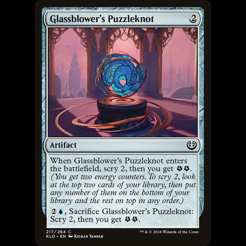 When Glassblower's Puzzleknot enters the battlefield, scry 2, then you get . (You get two energy counters. To scry 2, look at the top two cards of your library, then put any number of them on the bottom of your library and the rest on top in any order.)