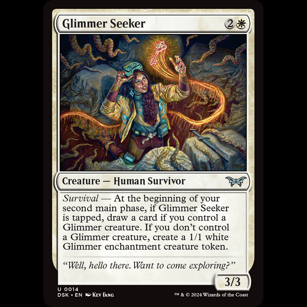 Survival — At the beginning of your second main phase, if Glimmer Seeker is tapped, draw a card if you control a Glimmer creature. If you don't control a Glimmer creature, create a 1/1 white Glimmer enchantment creature token.