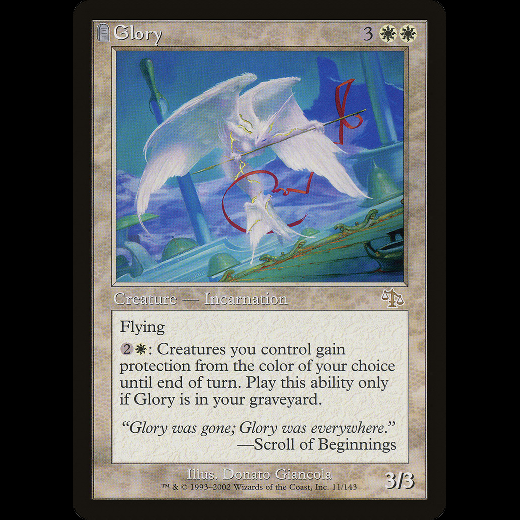 : Choose a color. Creatures you control gain protection from the chosen color until end of turn. Activate only if Glory is in your graveyard.