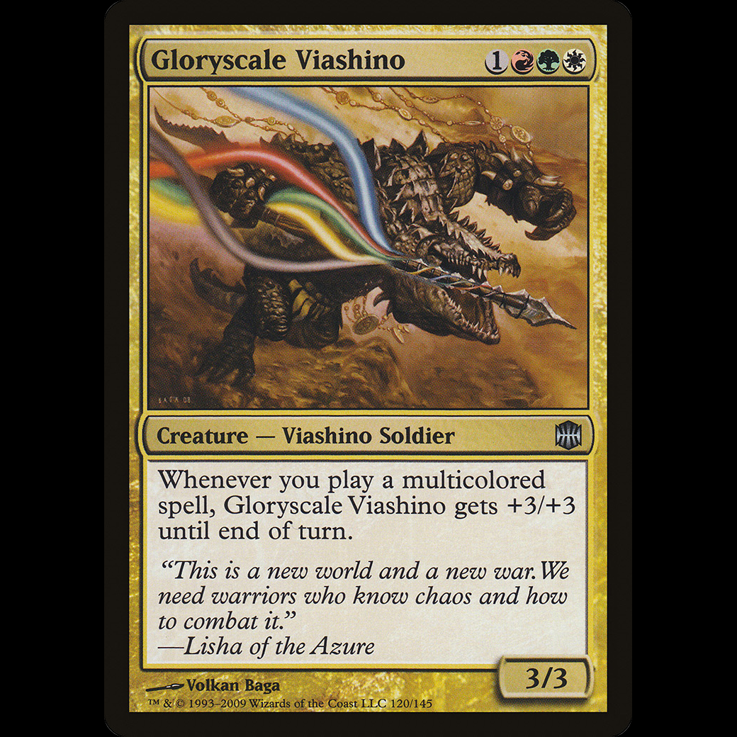 Whenever you cast a multicolored spell, Gloryscale Viashino gets +3/+3 until end of turn.