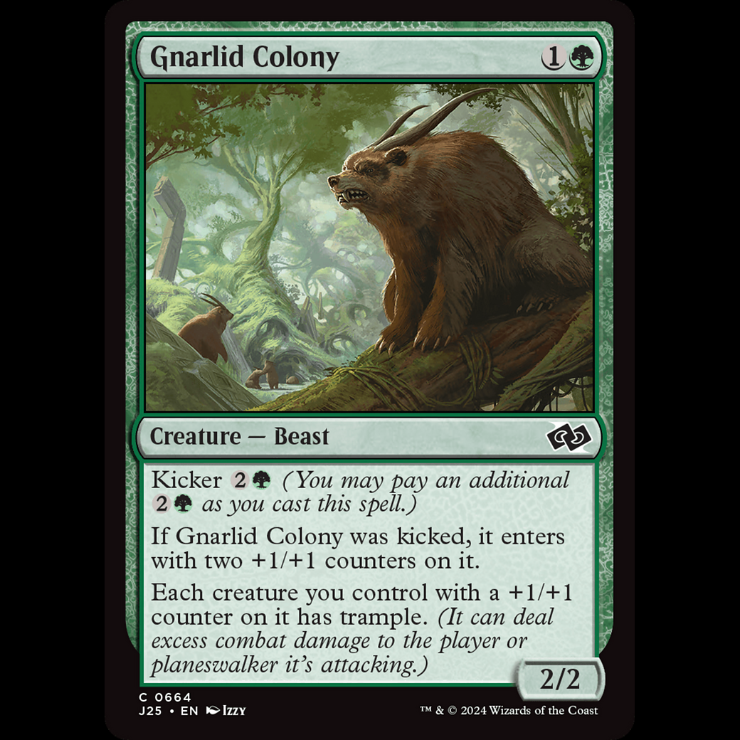 MTG Gnarlid Colony Foundations Jumpstart j25#664 Kicker (You may pay an additional as you cast this spell.) If this creature was kicked, it enters with two +1/+1 counters on it. Each creature you control with a +1/+1 counter on it has trample. (It can deal excess combat damage to the player or planeswalker it's attacking.)