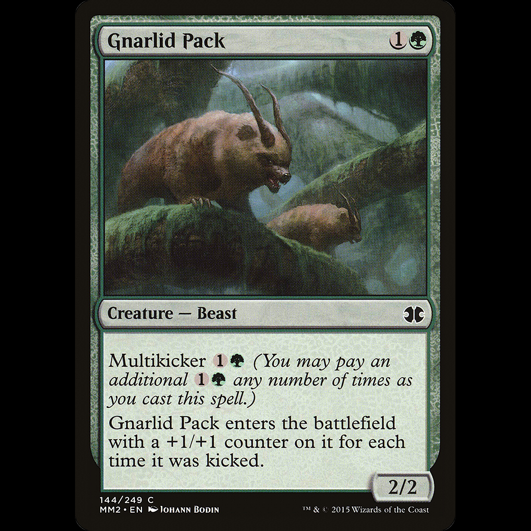 Gnarlid Pack enters the battlefield with a +1/+1 counter on it for each time it was kicked.