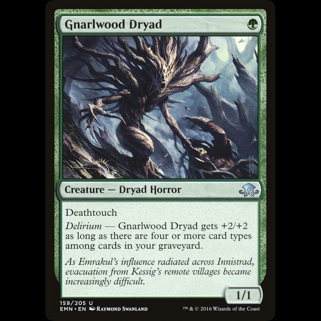 Delirium — Gnarlwood Dryad gets +2/+2 as long as there are four or more card types among cards in your graveyard.