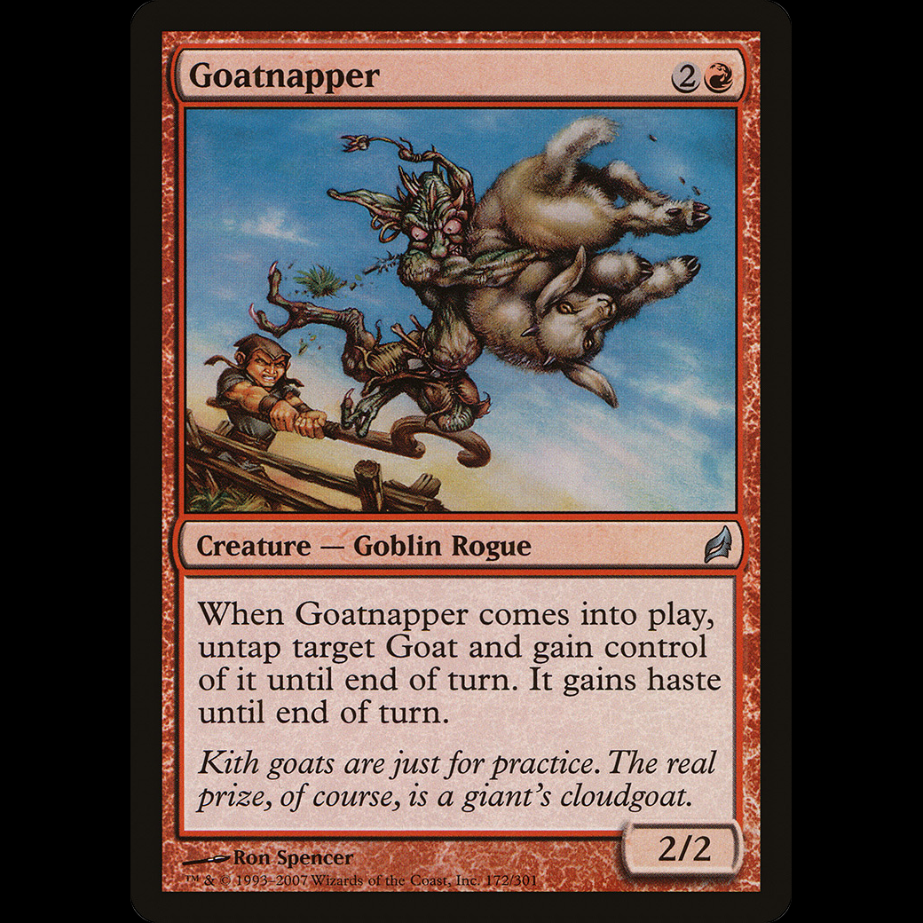When Goatnapper enters the battlefield, untap target Goat and gain control of it until end of turn. It gains haste until end of turn.
