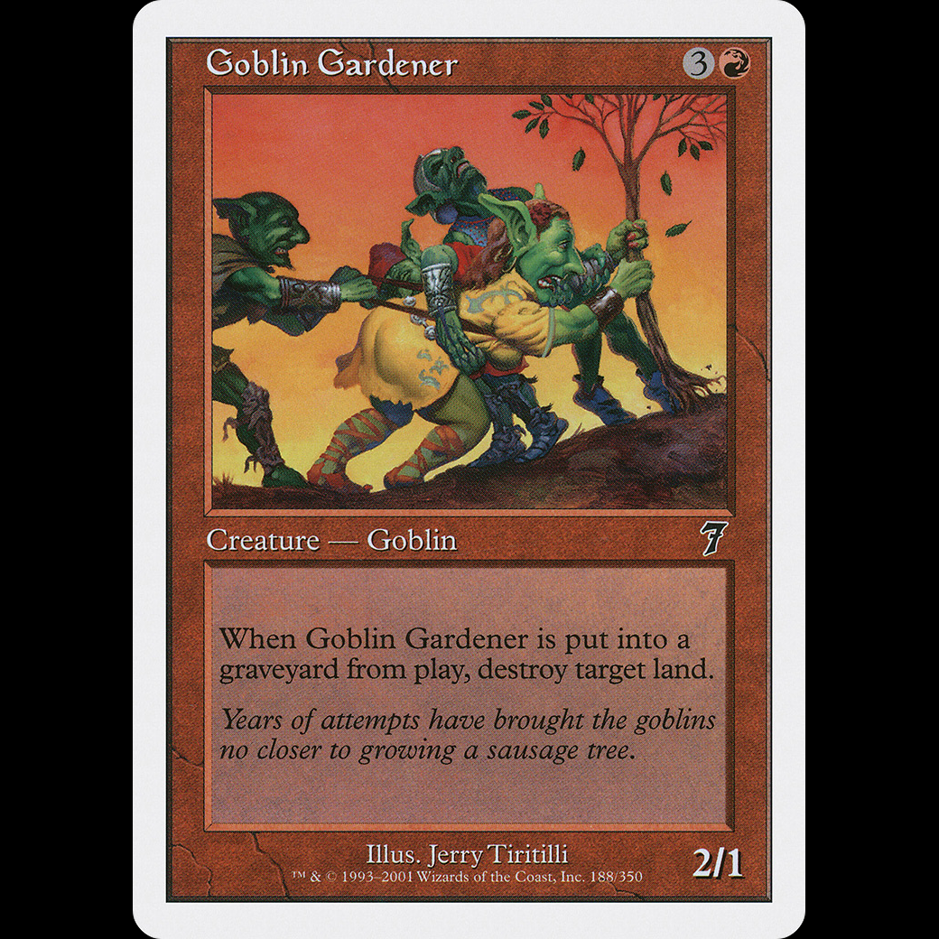 MTG Goblin Gardener Seventh EditionWhen Goblin Gardener dies, destroy target land.