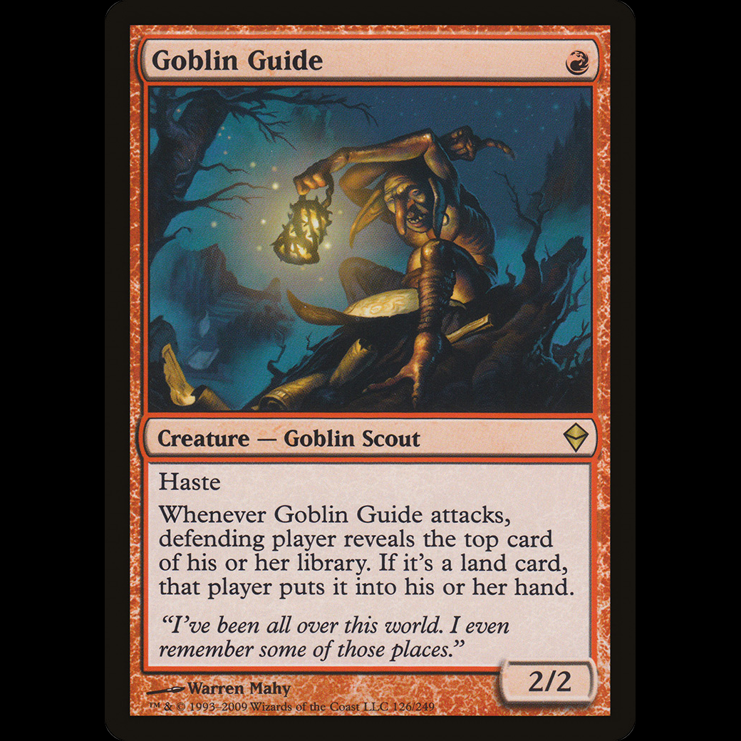 Whenever Goblin Guide attacks, defending player reveals the top card of their library. If it's a land card, that player puts it into their hand.