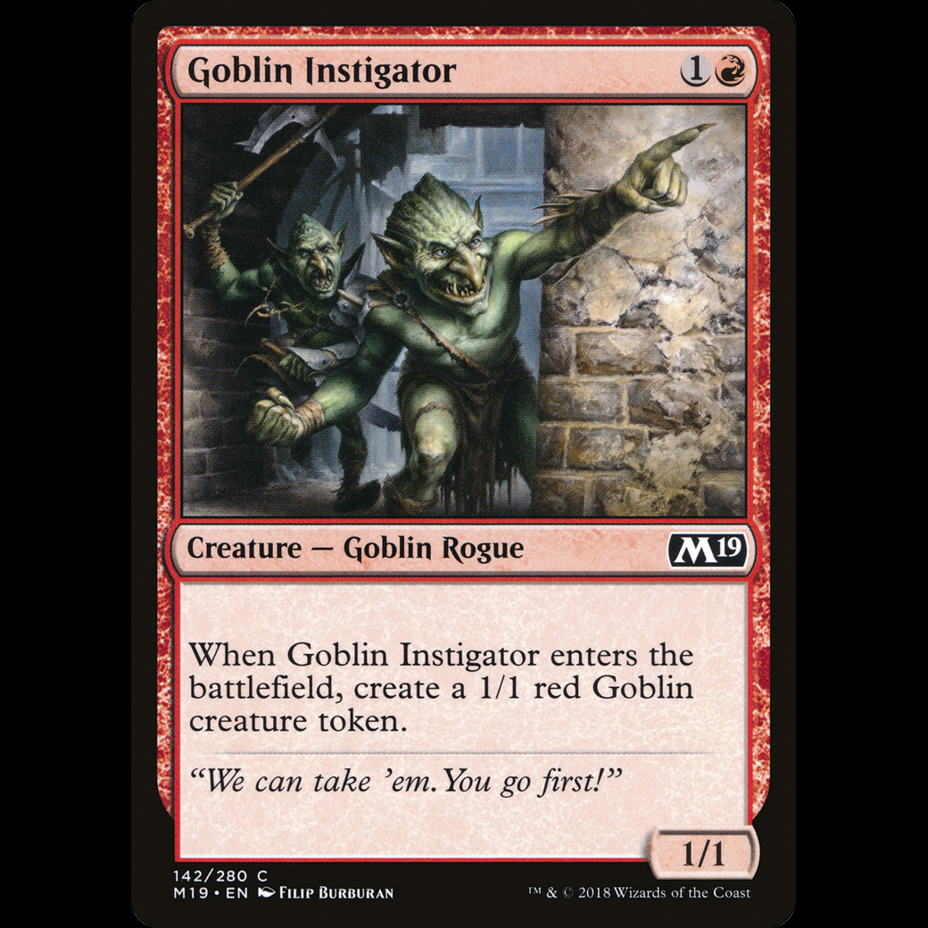 When Goblin Instigator enters the battlefield, create a 1/1 red Goblin creature token.