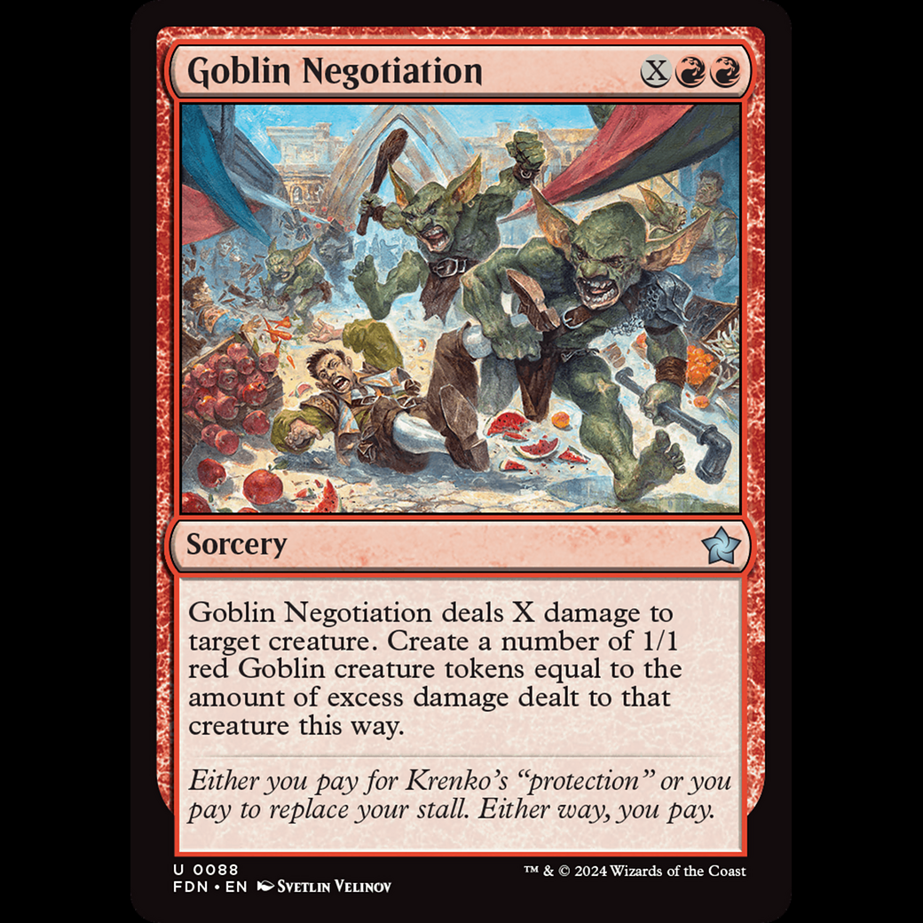 Goblin Negotiation deals X damage to target creature. Create a number of 1/1 red Goblin creature tokens equal to the amount of excess damage dealt to that creature this way.
