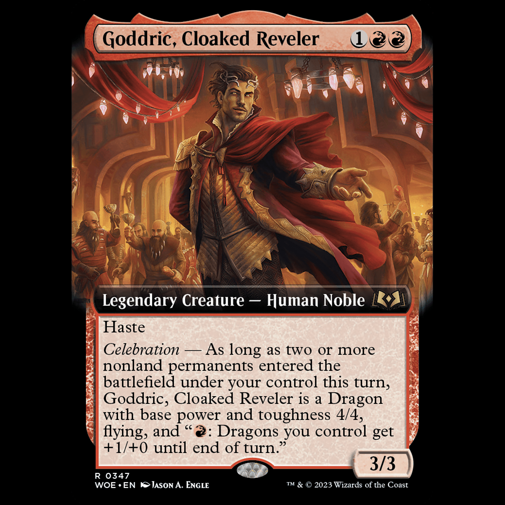 Celebration — As long as two or more nonland permanents entered the battlefield under your control this turn, Goddric, Cloaked Reveler is a Dragon with base power and toughness 4/4, flying, and ": Dragons you control get +1/+0 until end of turn." (It loses all other creature types.)