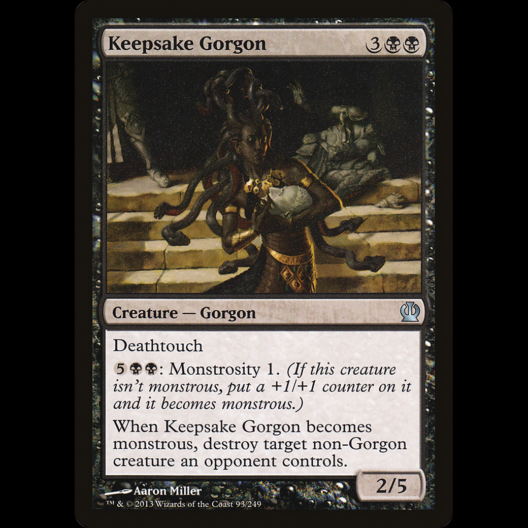 When Keepsake Gorgon becomes monstrous, destroy target non-Gorgon creature an opponent controls.
