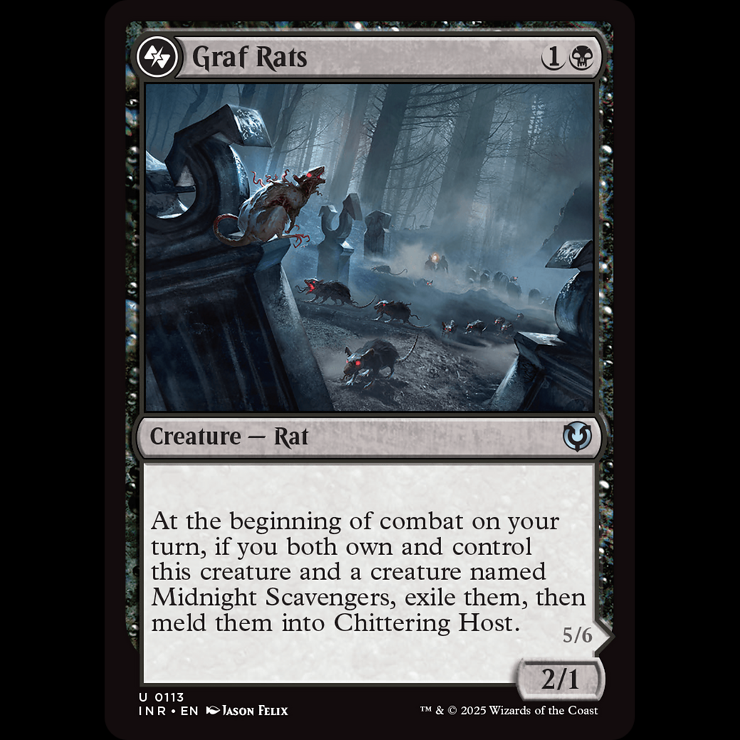 At the beginning of combat on your turn, if you both own and control Graf Rats and a creature named Midnight Scavengers, exile them, then meld them into Chittering Host.