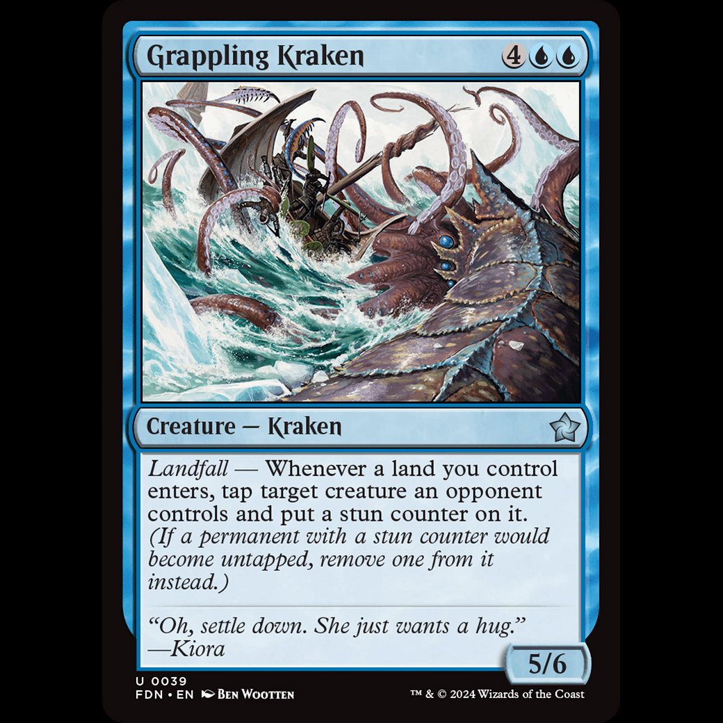 Landfall — Whenever a land you control enters, tap target creature an opponent controls and put a stun counter on it. (If a permanent with a stun counter would become untapped, remove one from it instead.)