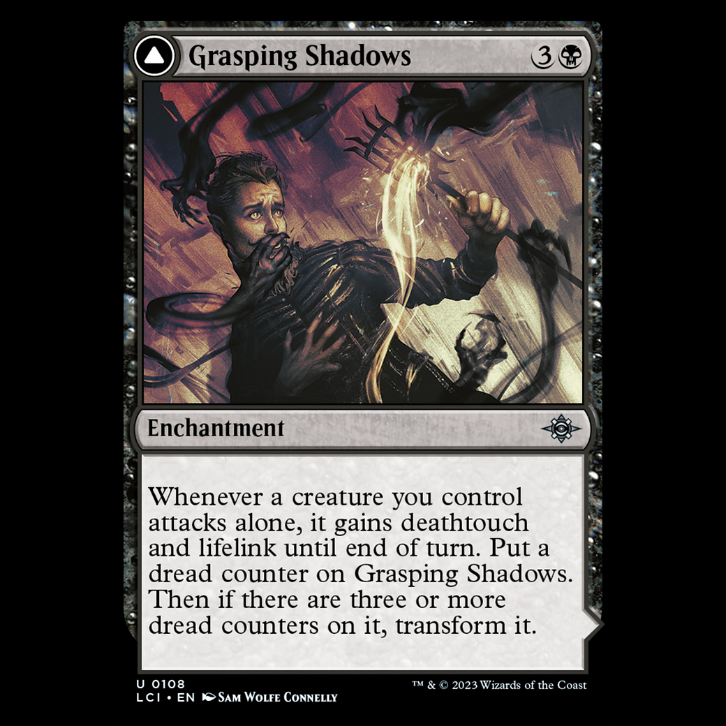 Whenever a creature you control attacks alone, it gains deathtouch and lifelink until end of turn. Put a dread counter on Grasping Shadows. Then if there are three or more dread counters on it, transform it.