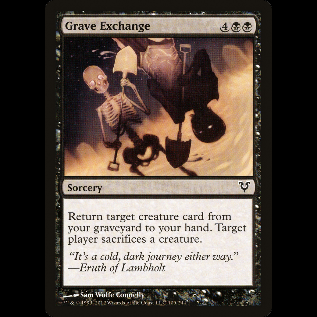 Return target creature card from your graveyard to your hand. Target player sacrifices a creature.