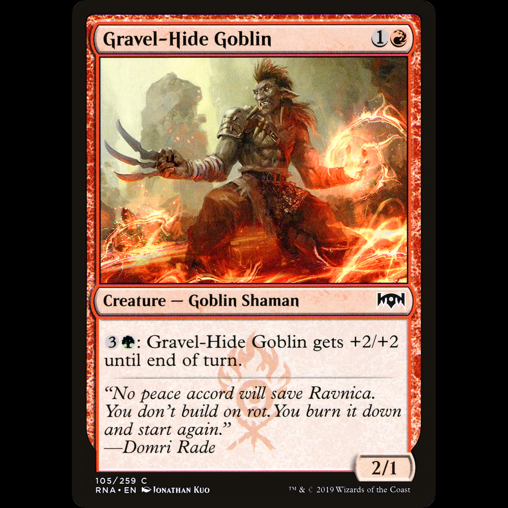 MTG Gravel-Hide Goblin Ravnica Allegiance rna#105: Gravel-Hide Goblin gets +2/+2 until end of turn.