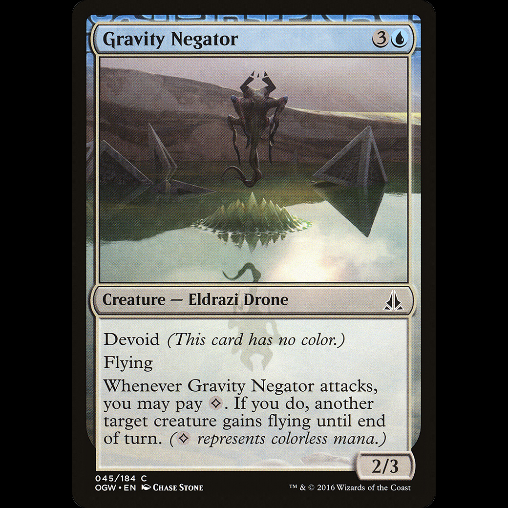 Whenever Gravity Negator attacks, you may pay . If you do, another target creature gains flying until end of turn. ( represents colorless mana.)