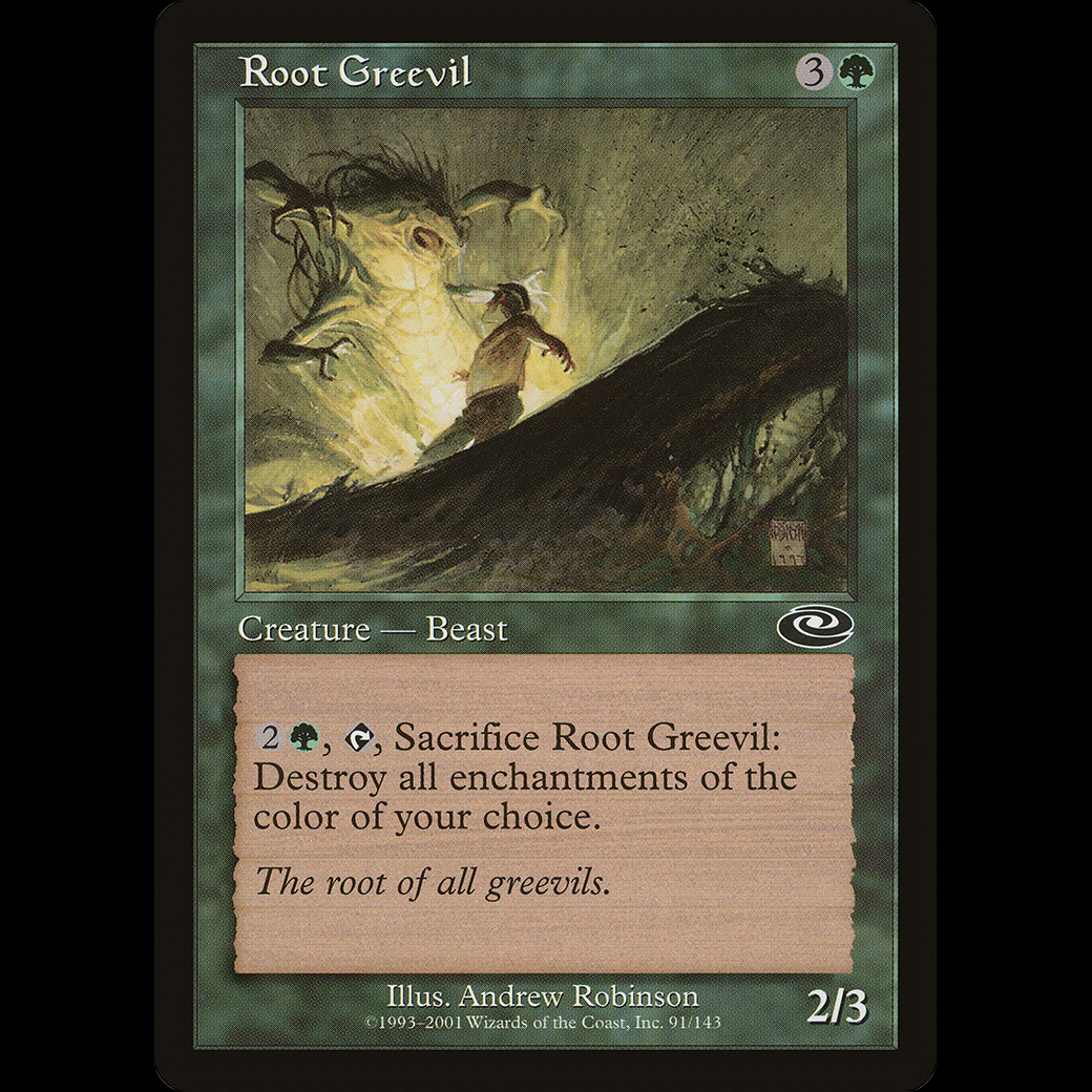 , , Sacrifice Root Greevil: Destroy all enchantments of the color of your choice.