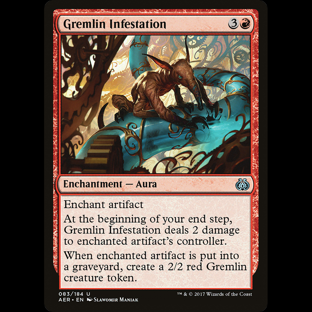 When enchanted artifact is put into a graveyard, create a 2/2 red Gremlin creature token.
