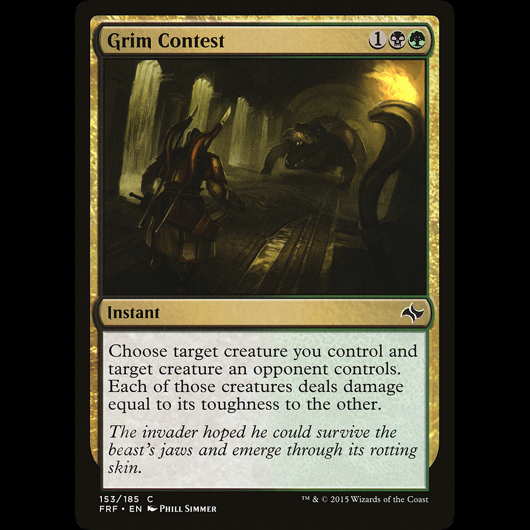 Choose target creature you control and target creature an opponent controls. Each of those creatures deals damage equal to its toughness to the other.
