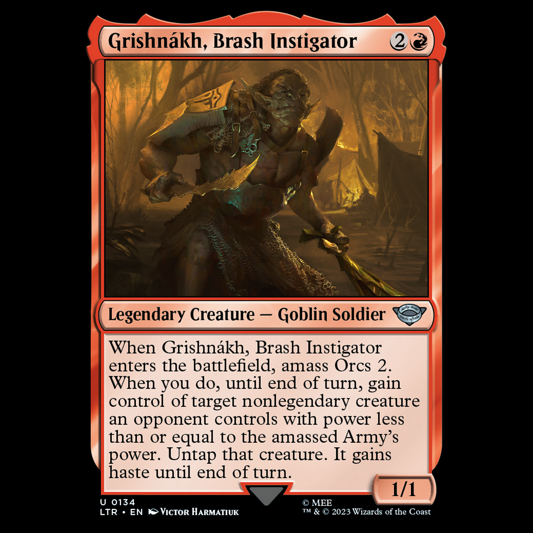 When Grishnákh, Brash Instigator enters, amass Orcs 2. When you do, until end of turn, gain control of target nonlegendary creature an opponent controls with power less than or equal to the amassed Army's power. Untap that creature. It gains haste until end of turn.