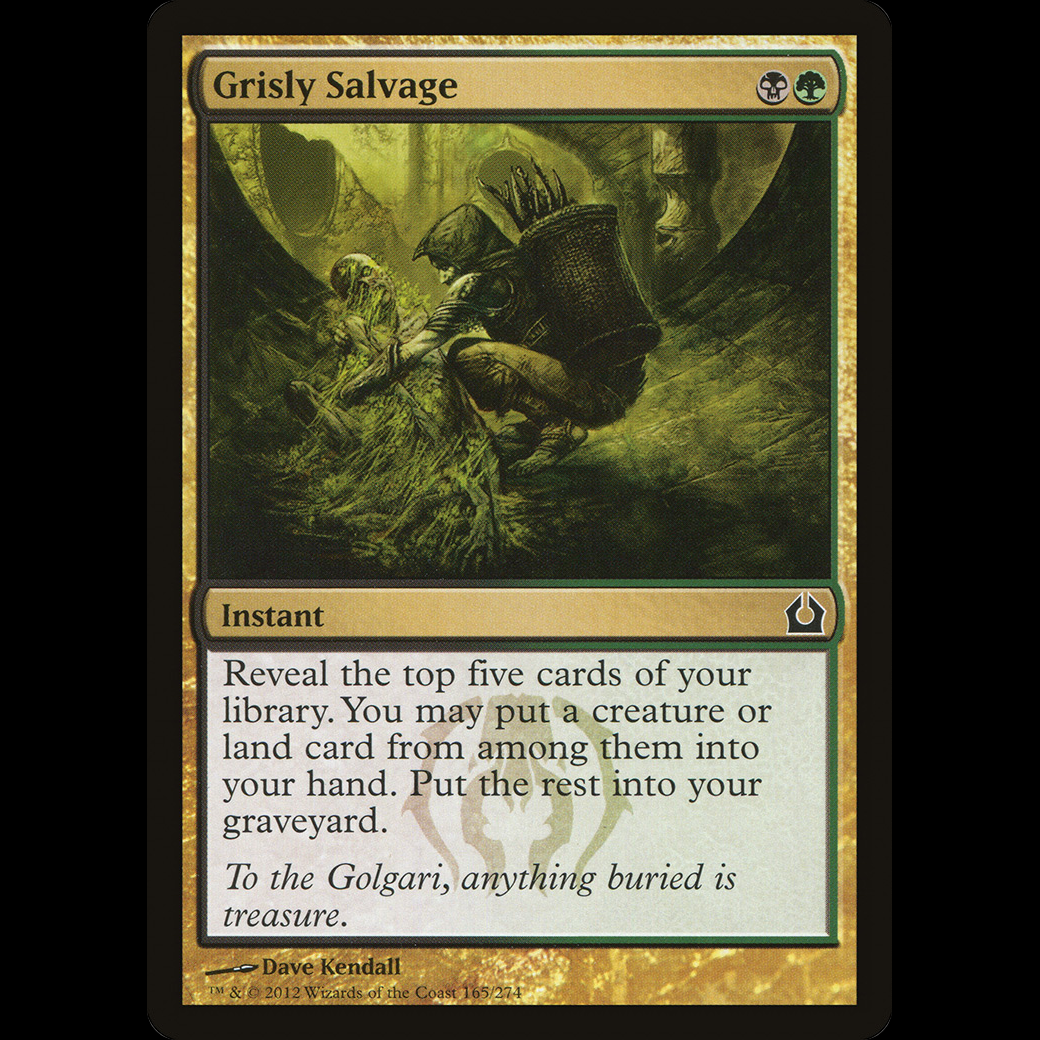 Reveal the top five cards of your library. You may put a creature or land card from among them into your hand. Put the rest into your graveyard.