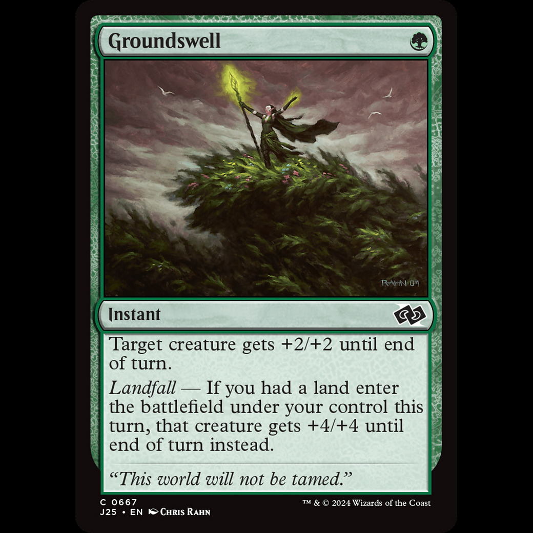 Landfall — If you had a land enter the battlefield under your control this turn, that creature gets +4/+4 until end of turn instead.
