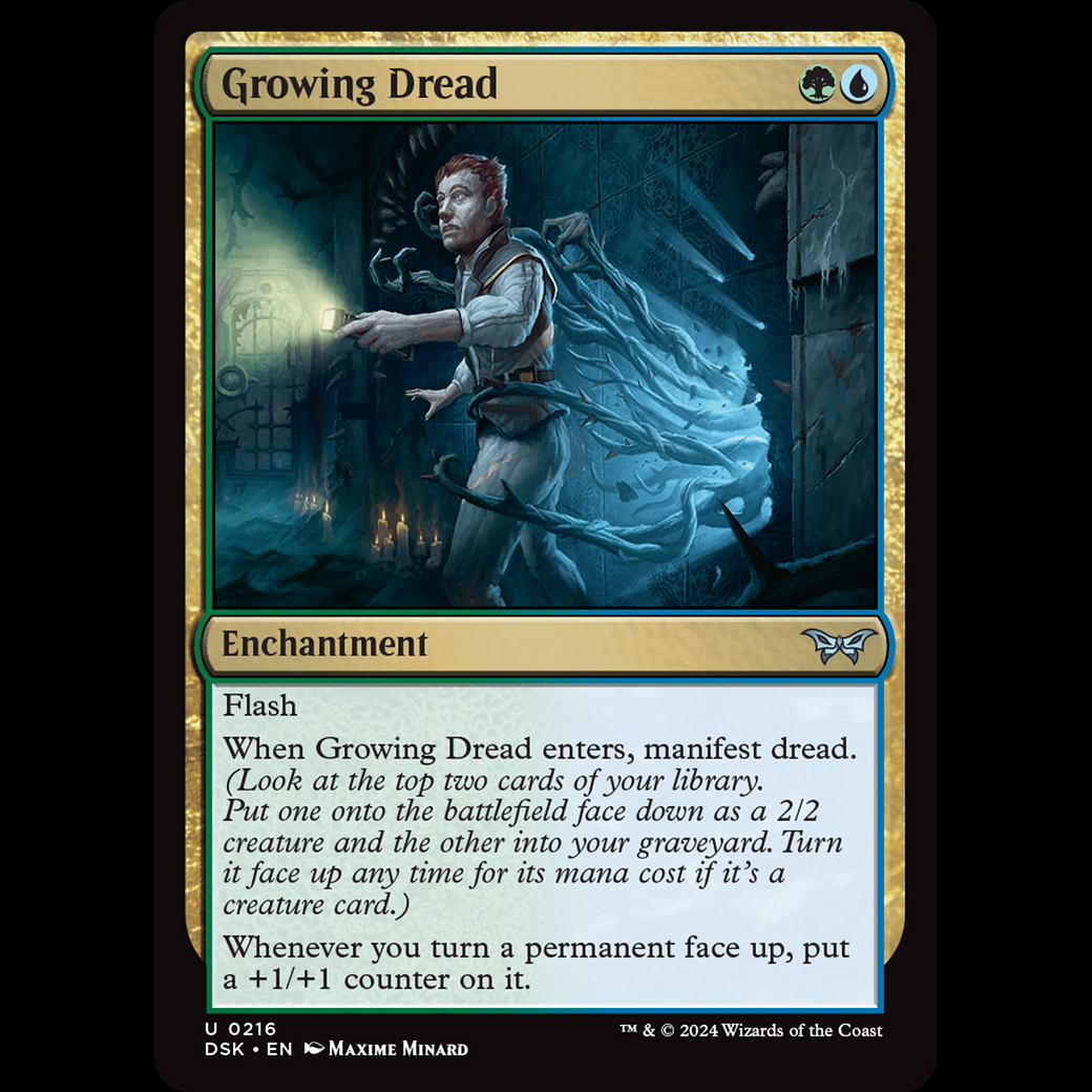 When Growing Dread enters, manifest dread. (Look at the top two cards of your library. Put one onto the battlefield face down as a 2/2 creature and the other into your graveyard. Turn it face up any time for its mana cost if it's a creature card.)