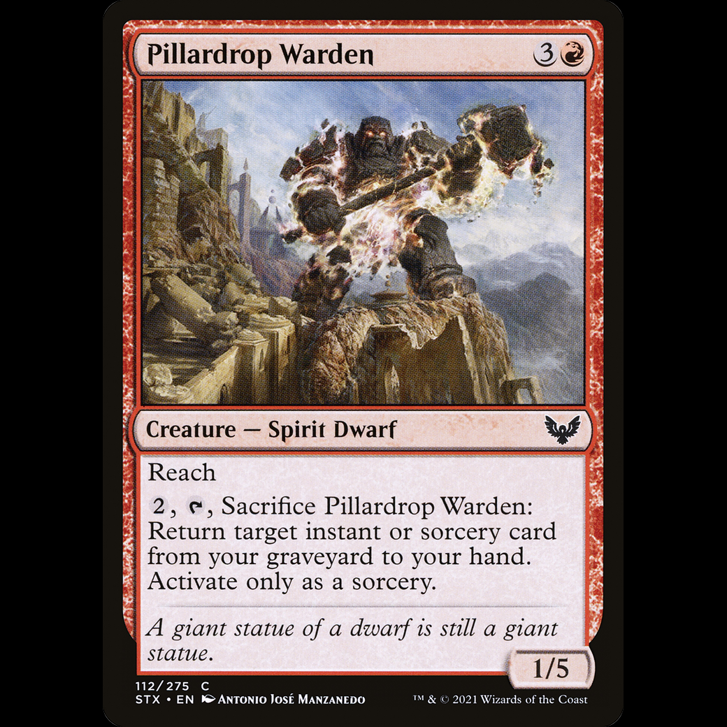 MTG Guarda de Barrancolumna (Pillardrop Warden) Strixhaven: School of Mages stx#112Reach , , Sacrifice this creature: Return target instant or sorcery card from your graveyard to your hand. Activate only as a sorcery.
