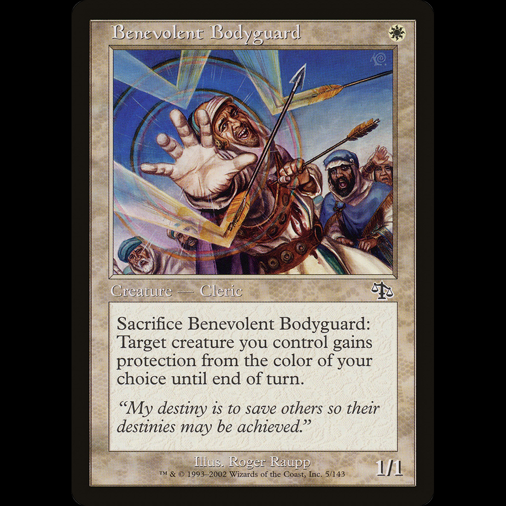 Sacrifice Benevolent Bodyguard: Target creature you control gains protection from the color of your choice until end of turn.