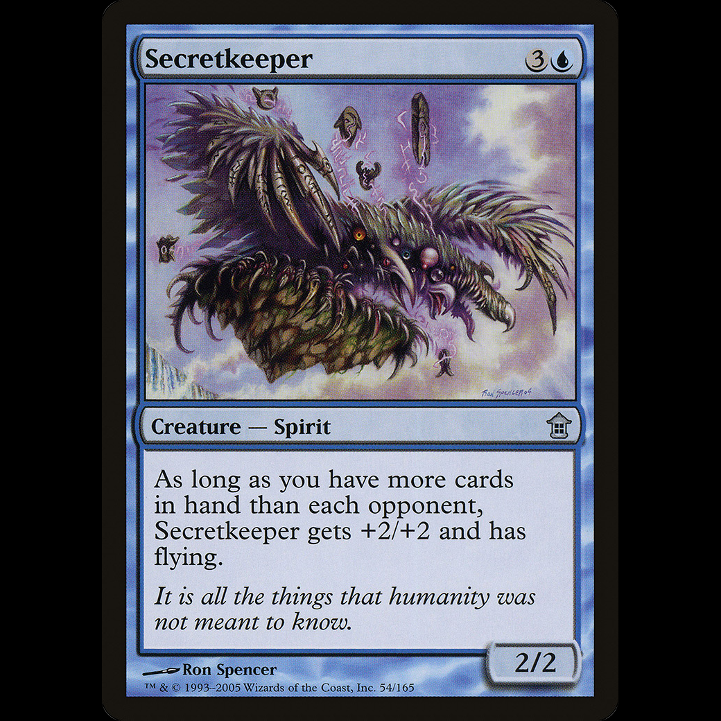 As long as you have more cards in hand than each opponent, Secretkeeper gets +2/+2 and has flying.