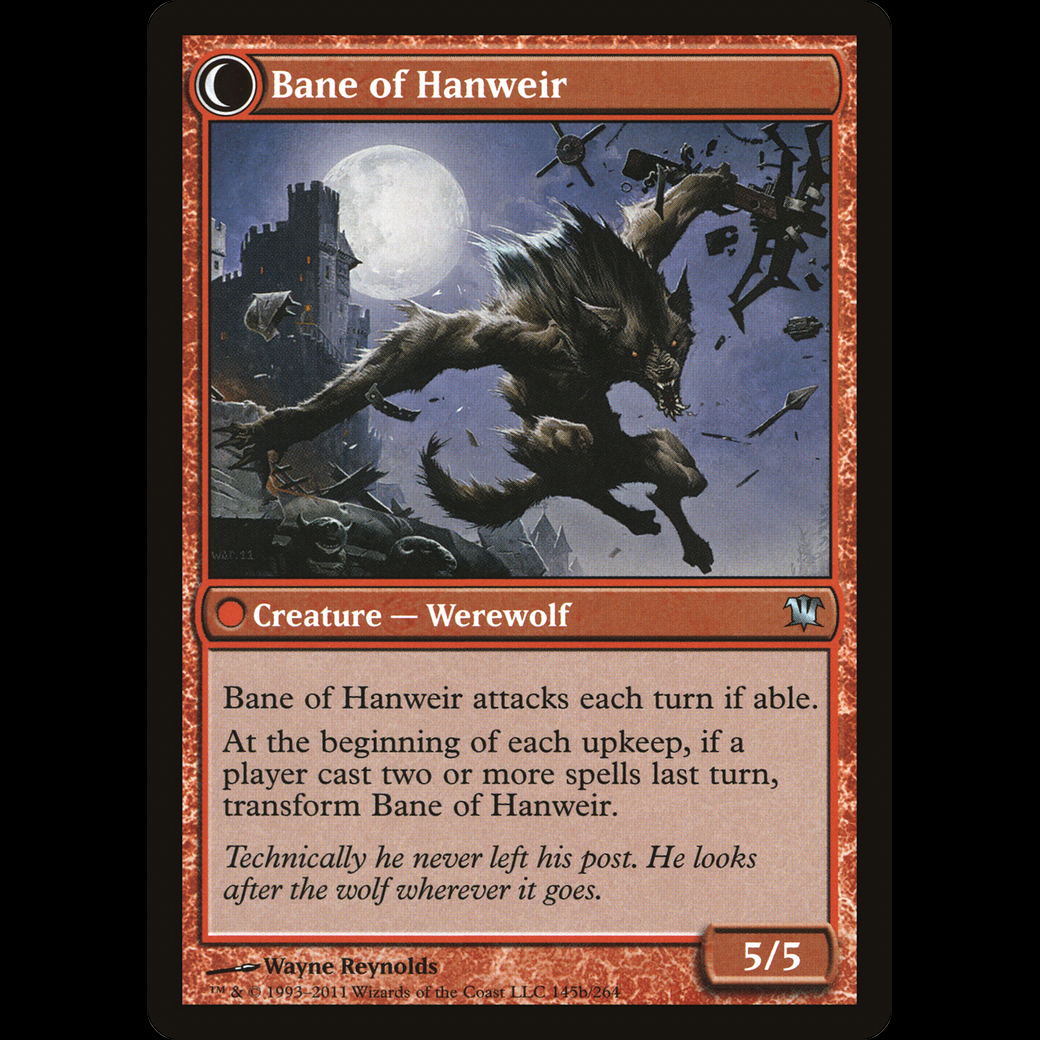 At the beginning of each upkeep, if a player cast two or more spells last turn, transform Bane of Hanweir.