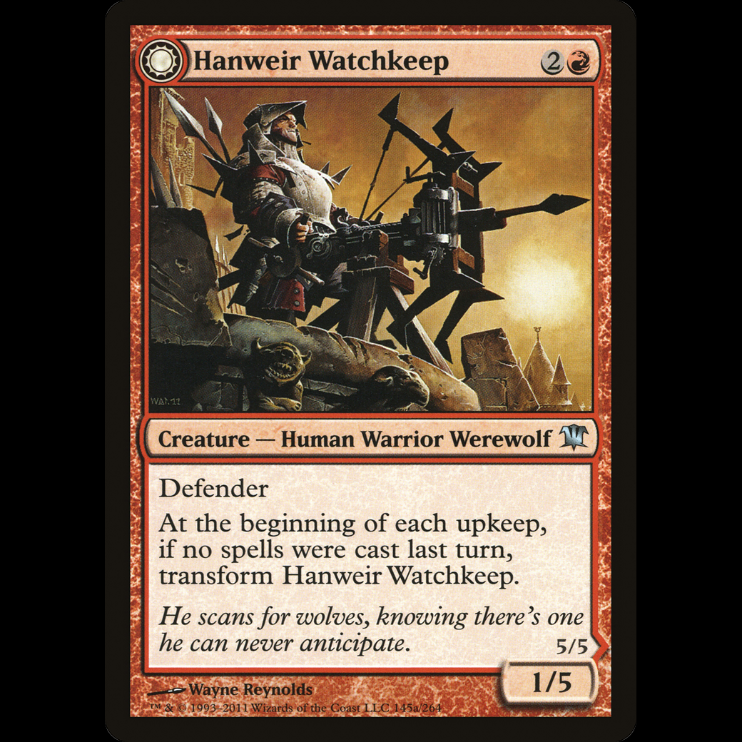 At the beginning of each upkeep, if no spells were cast last turn, transform Hanweir Watchkeep.