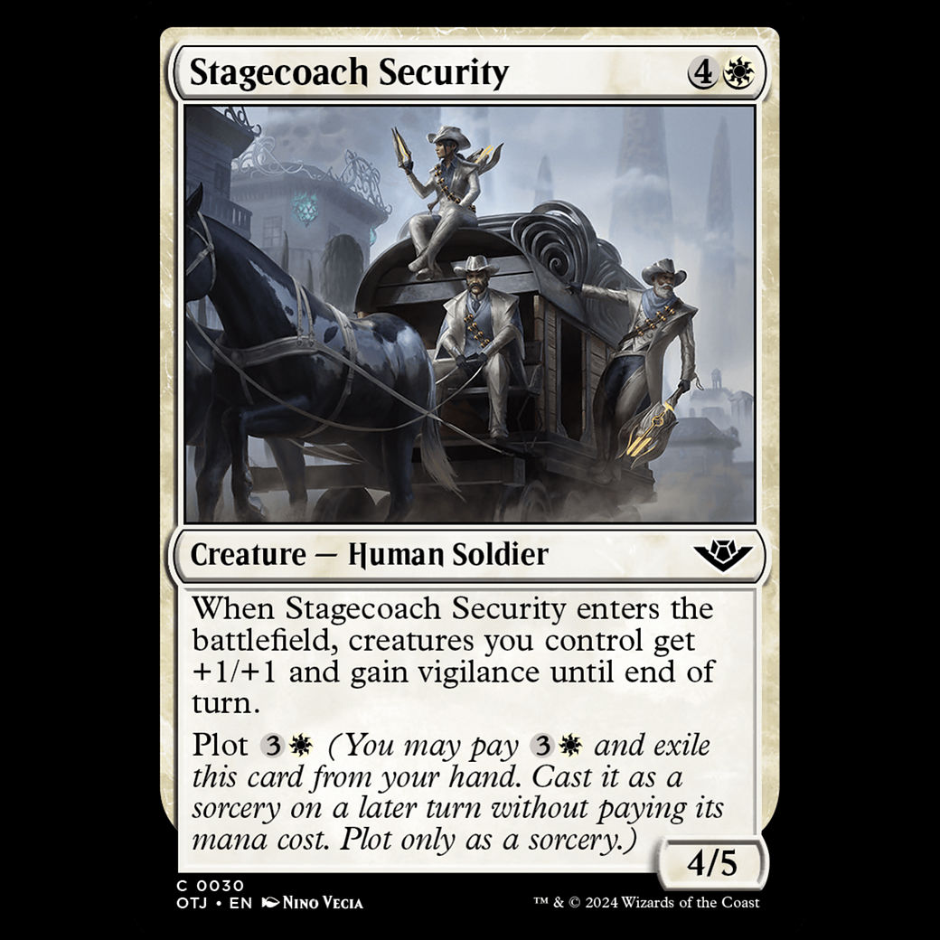 MTG Guardias de la diligencia (Stagecoach Security) Outlaws of Thunder Junction otj#30 When Stagecoach Security enters, creatures you control get +1/+1 and gain vigilance until end of turn. Plot (You may pay and exile this card from your hand. Cast it as a sorcery on a later turn without paying its mana cost. Plot only as a sorcery.)
